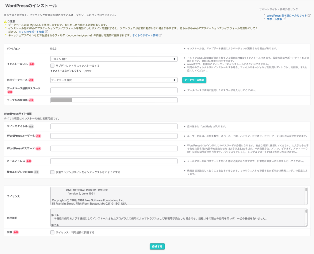 さくらインターネットでドメインを取得してあれば選択肢に表示されます。あらかじめサブドメインなどを設定しておくことで選択ができるようになります。サブディレクトリにインストールすることもできます。